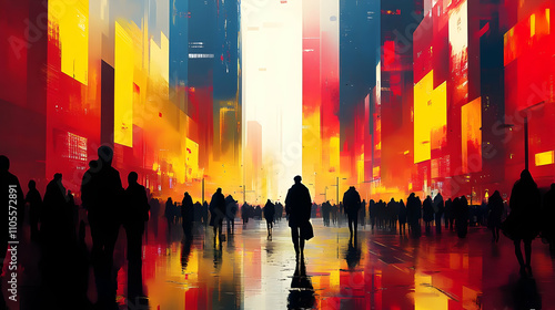 © Siasart Studio, Obraz premium Urban Exploration: A City's Vibrant Hues at Dusk, Crowds Moving Through Reflective Streets