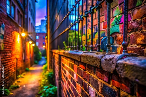 Fototapeta premium Urban Exploration: Brick Wall Graffiti, Half Wall, Privacy Fence, Decaying...