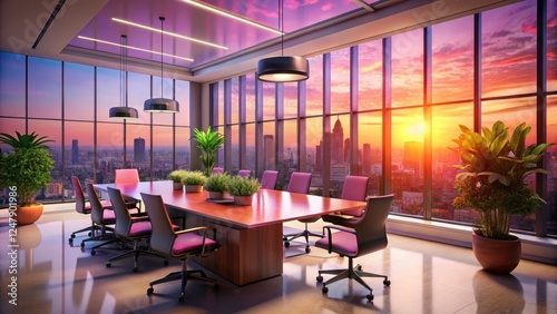 © kansak01, Fototapeta premium Urban Exploration Photography: Pink Sunset Modern Meeting Room - Large Windows, Plants