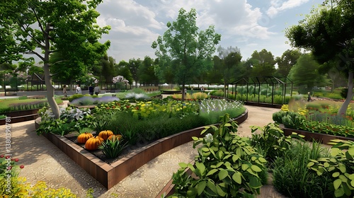Naklejka premium Urban food forest with a mix of edible perennials, fruit trees, and herbs, designed for sustainable food production