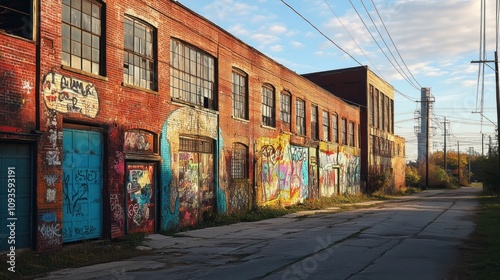 Fototapeta premium Urban Graffiti Alley: Sunlit Brick Buildings and Vibrant Street Art