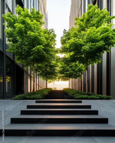 Obraz premium Urban Green Oasis Lush Tree-Lined Pathway Between Sleek Glass Office Towers -...