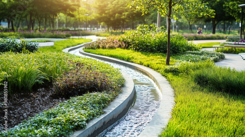 Fototapeta premium Urban green space with eco-friendly drainage system