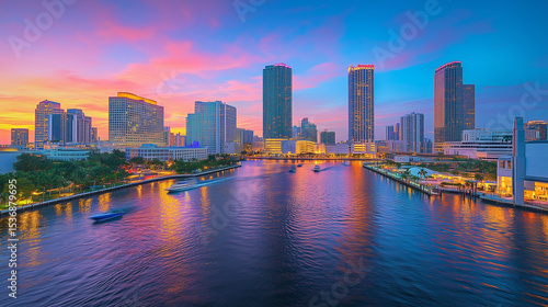 Fototapeta premium Urban Harbour Night Skyline with Skyscrapers and Neon Reflections