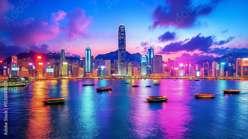 Fototapeta premium Urban Harbour Night Skyline with Skyscrapers and Neon Reflections
