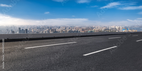 © zhouyilu, Fototapeta premium Urban Highway Overlooking Cityscape with Blue Sky