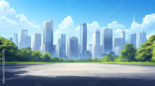 © Almaz, Obraz premium "Urban Horizons: A Modern Cityscape with Asphalt Road and Skyline"