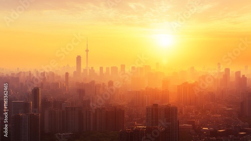 © AnImagine, Fototapeta premium Urban Infrastructure at Sunset in a Dense Cityscape