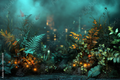 Obraz premium Urban Jungle with Glowing Plants and Cityscape