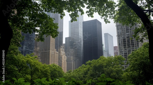 Obraz premium Urban Landscape Framed by Lush Greenery in City Park