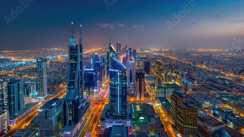 © Afeefa_Rehman, Obraz premium Urban landscape from the heights of skyscrapers at dusk