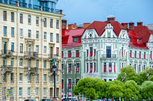 © vagrig, Naklejka premium Urban landscape with historic, colorful buildings on a summer evening on the background of the cloudy sky.