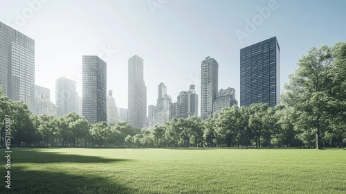 © Aris Suwanmalee, Fototapeta premium Urban landscape with lush greenery and skyscrapers.