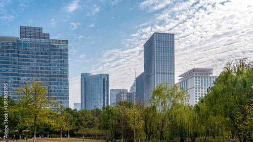 © zhouyilu, Fototapeta premium Urban Landscape with Modern Skyscrapers and Greenery