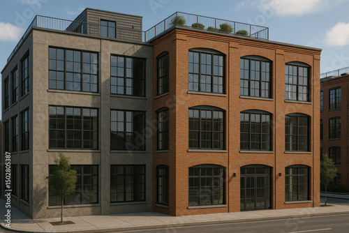 Fototapeta premium Urban loft building with rooftop terrace and large windows in modern city setting under clear sky