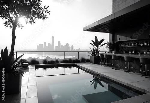© Mubashir, Obraz premium Urban Luxury: Rooftop Pool and Bar Overlooking the City