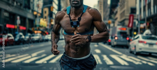 Fototapeta premium Urban Marathon Runner with Heart Rate Monitor on City Streets for Fitness...