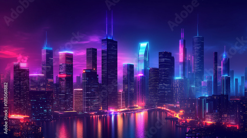 Fototapeta premium Urban Metropolis Nightview With Neon Glowing Skyscrapers Reflecting On...
