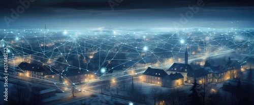 Naklejka premium urban network in the net of buildings under blue light Generative AI
