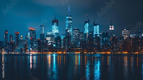 Fototapeta premium Urban night lights reflections. A breathtaking vista of a metropolis bathed in the glow of nighttime illumination, its towering structures mirrored in the tranquil waters below.