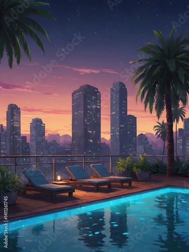 © Ambient Sanctuary, Obraz premium Urban Oasis at Twilight – Anime-Style City Rooftop Pool Wallpaper