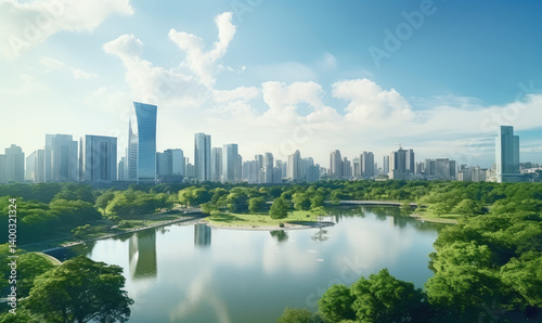© evening_tao, Fototapeta premium Urban Oasis: Nature Meets Skyline
