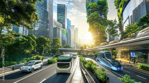 Fototapeta premium Urban Oasis of 2025: Autonomous Electric Vehicles on Smart Roads, Flanked by...