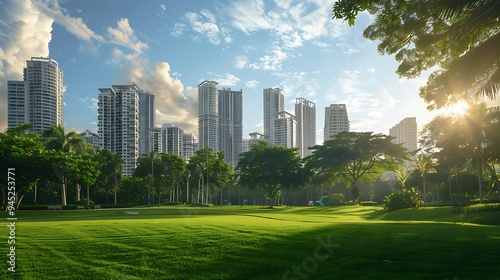 © yusmahendra0408, Fototapeta premium Urban Oasis: Skyscrapers and Lush Greenery