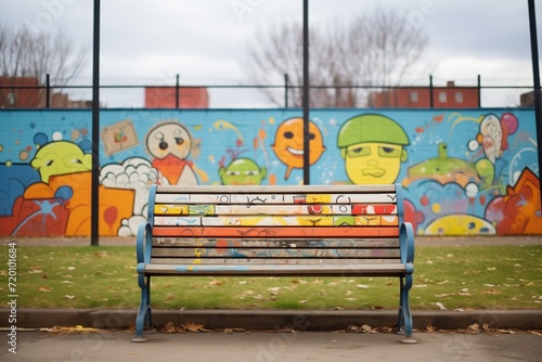 © stickerside, Naklejka premium urban park bench near a fence with graffiti patterns