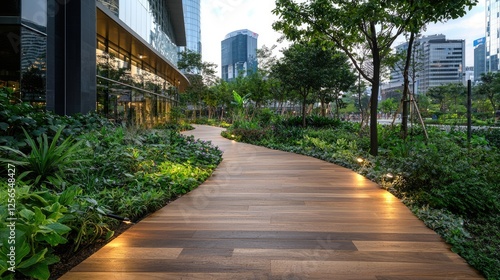Obraz premium Urban park walkway, modern city, evening scene, peaceful atmosphere, suitable...