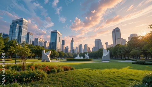 © Kitta Studio, Fototapeta premium Urban Park with Modern Sculptures and City Skyline at Sunset