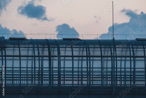 Obraz premium Urban pedestrian bridge with glass panels at sunset
