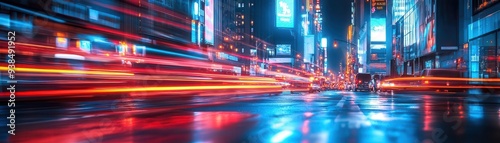 © Nawarit, Fototapeta premium Urban photography capturing the bustling energy of a city at night, with neon lights and blurred motion, Dynamic, Cool Tones, Wide Angle