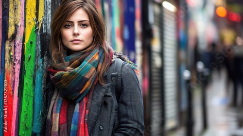 © Saranya001, Fototapeta premium Urban portrait of a young woman colorful alley lifestyle photography city environment close-up view expression of style