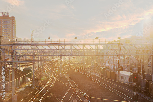 Fototapeta premium Urban railway scene at sunset with multiple tracks and buildings in the...