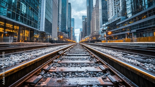 © Kitta Studio, Fototapeta premium Urban railway tracks stretch through a bustling cityscape, surrounded by towering skyscrapers under a dramatic sky.