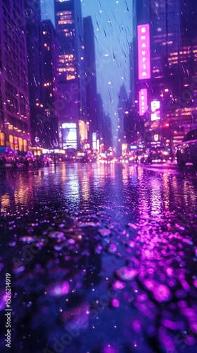 © dewpra, Obraz premium Urban rainfall symphony: A nocturnal canvas painted with neon light and shimmering reflections