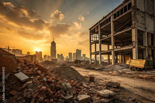 © Apon, Fototapeta premium Urban Renewal Site with Ruined Building at Sunset