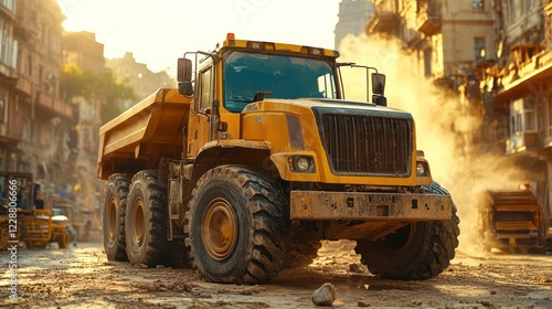 Obraz premium Urban road construction, dump truck, dust