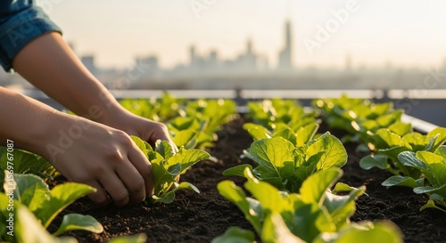 © Rastika, Obraz premium Urban Rooftop Garden: Hands Tending Young Bok Choy with Cityscape Backdrop