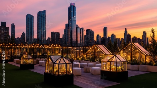 © Udin, Obraz premium Urban rooftop garden with glass greenhouses at sunset, showcasing vibrant plants and city skyline