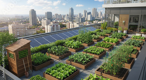 Obraz premium Urban rooftop garden with solar panels and diverse plants, promoting...