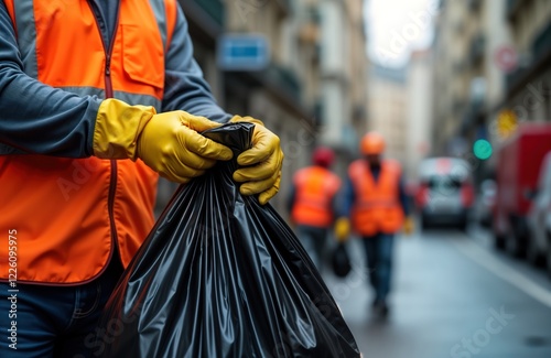 © miss irine, Obraz premium Urban sanitation workers clear city streets diligently. Worker carefully seals black garbage bag. Workers walk by. Eco-conscious urban scene happens outdoors on city street during daytime. City