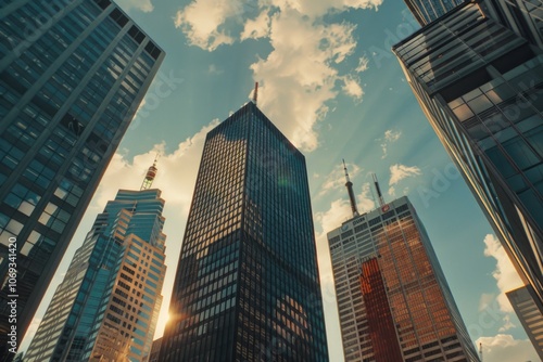 Obraz premium Urban scene with sunlight shining through skyscraper windows
