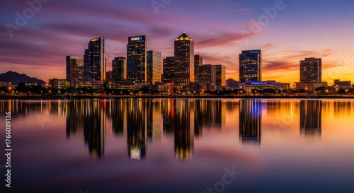 © budi, Fototapeta premium Urban serenity cityscape reflection at sunset with colorful gradient sky creating a tranquil scene