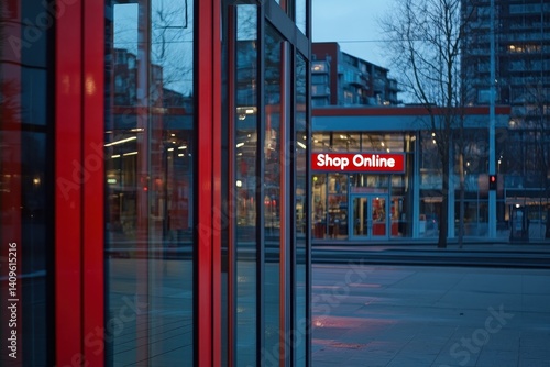 © AHNH3, Naklejka premium Urban Shopping Scene with Glossy Red Storefront and Online Signage