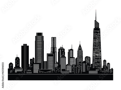 Naklejka premium Urban Silhouette: A sleek, minimalist representation of a modern cityscape, featuring iconic skyscrapers, high-rise structures, and a dynamic skyline. Perfect for conveying urban sophistication.
