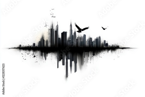 Fototapeta premium Urban Silhouette with Flying Birds and Reflections on a White Background – Abstract Cityscape Design for Creative Projects and Visual Arts