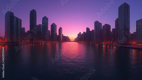 Fototapeta premium Urban skyline at dusk, featuring tall buildings reflecting on calm water,...