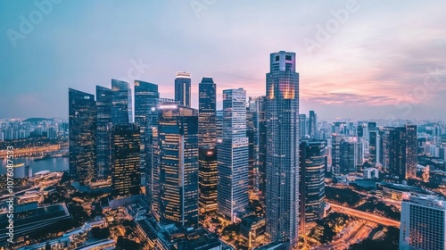 © Puttipong, Obraz premium Urban Skyline at Dusk with City Lights and Clouds